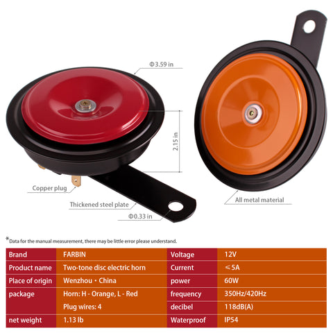 【Include】1 High tone:420Hz; 1 Low tone:350HZ; 4 pcs steel sheet; 4 copper wires; Wiring harness set with relay and fuse.