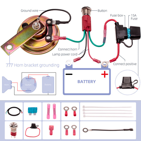 Horn set includes :Disc horn, horn button, wire harness,interface,plug,Fuse,Weather proof fuse holder,Plastic threaded pipe,Bandage etc. ,all installation material included.